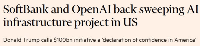 Se anuncia el proyecto Stargate, una iniciativa conjunta anunciada el 21 de enero de 2025 por OpenAI, SoftBank, Oracle, Microsoft y Nvidia, entre otros, con el objetivo de invertir hasta US $500 billones en infraestructura de AI en Estados Unidos durante los próximos 4 años. Servirá exclusivamente a OpenAI.