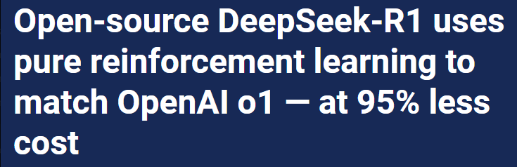 Me refiero a lo que ahorita está en los encabezados de medios importantes: DeepSeek. Lo compartí el martes pasado y las noticias relevantes a esa nota, sin embargo, solo hasta que los medios informáticos más importantes lo publicaran es cuando se ve una caída importante en las empresas Big Tech. Para más información al respecto, hay que visitar el canal #ai-ar-ml-vr.