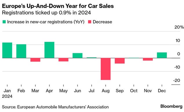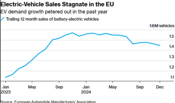 Los fabricantes de automóviles europeos se preparan para otro año difícil en 2025, con objetivos más estrictos de emisiones de la Unión Europea que los obligan a vender más vehículos eléctricos (EV) a pesar de la caída en la demanda. Tras haber sufrido una disminución de ventas en China, el mercado automotriz más grande del mundo, ahora también enfrentan la amenaza de aranceles adicionales en Estados Unidos bajo el presidente Trump.