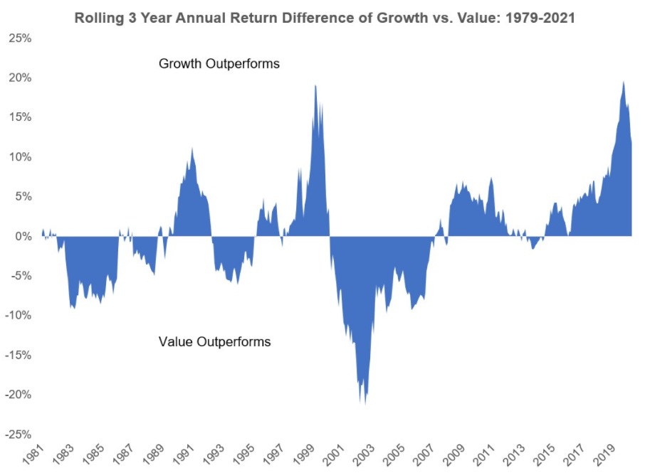 Figura 2 muestra en la gráfica la diferencia de rendimientos entre Growth y Value. En la punta más alta de la ‘burbuja’ tecnológica a finales de los 90s, Growth tenía rendimientos superiores de aproximadamente 20% comparada con Value. Y en los tiempos de recuperación económica, Value superaba a Growth por 20% en el 2003.
