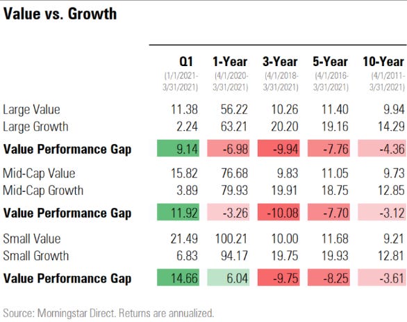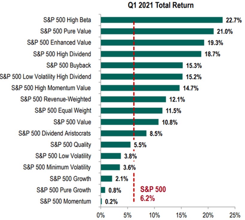 En los últimos 5 años, el crecimiento económico en EEUU ha sido estable, con tasas de interés a niveles históricamente bajos, con inflación por debajo del 2%, lo que ha permitido que las empresas Growth superen a sus ‘rivales’. Ahora, ¿con las altas expectativas de crecimiento económico en este 2021, dará la vuelta Value? En la figura 3 les muestro los rendimientos por ‘estilos’ del 1er trimestre del 2021.
