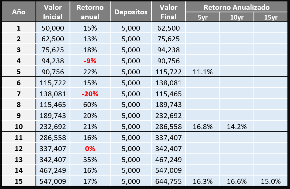 En los primeros 5 periodos el rendimiento calculado fue de 11.1% anual, en los siguientes 5 fue de 16.8%, y en los últimos 5 de 16.3% anual. Del año 1 al 10 el rendimiento anualizado fue 14.2%, y del 6 al 15 de 16.6%. La cantidad al final de los 15 años sigue siendo la misma que en el cálculo de arriba (figura 3) a pesar de que los rendimientos de cada año son distintos y algo volátiles. El propósito de la tabla es mostrar que existirán buenos y malos tiempos, y que aun así se pueden lograr los objetivos de largo plazo.