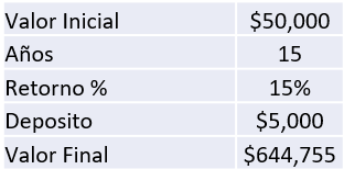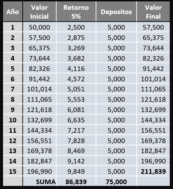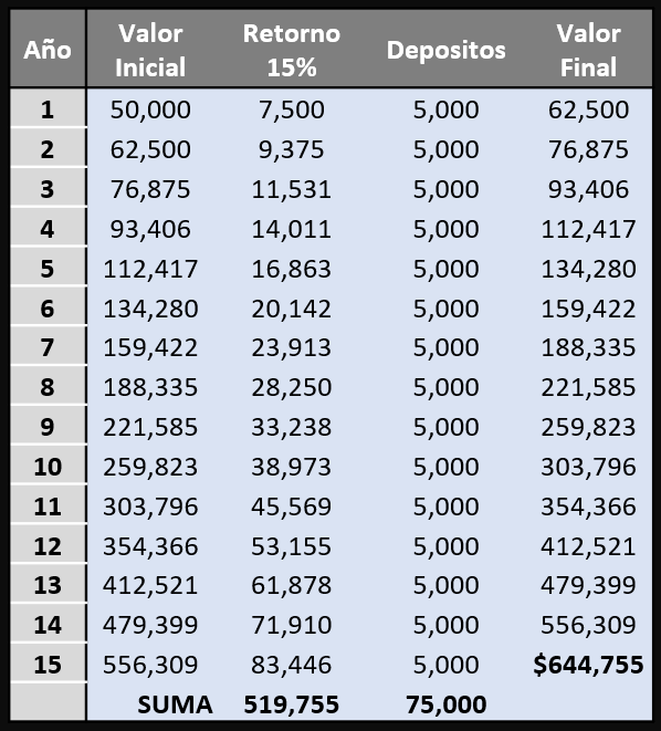 El inversionista inicia el año con una inversión de $50,000, y espera ganar un 5% anual en los próximos 15 años. Por lo tanto, su valor final en el primer año es de $57,500 (50,000 + 5% + 5,000). Al final de los 15 periodos, el total de depósitos habrá sido $75,000, y las ganancias generadas por las inversiones de $86,839, para llegar a la valuación final de $211,839. Si dichas cantidades no impresionan, tal vez sí con un retorno de 15% anual. Veamos: