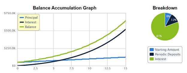 La estrategia de buscar rendimientos del 15% anual resultó en una diferencia en la valuación final de su cartera: $211,839 vs $644,755. El capital inicial y el ahorro mensual fueron los mismos en ambos casos ($50,000 + $75,000), pero el cambio de estrategia y el efecto del interés compuesto es notable. Una pequeña bola de nieve rodando por una colina no sólo gana velocidad, sino también volumen.