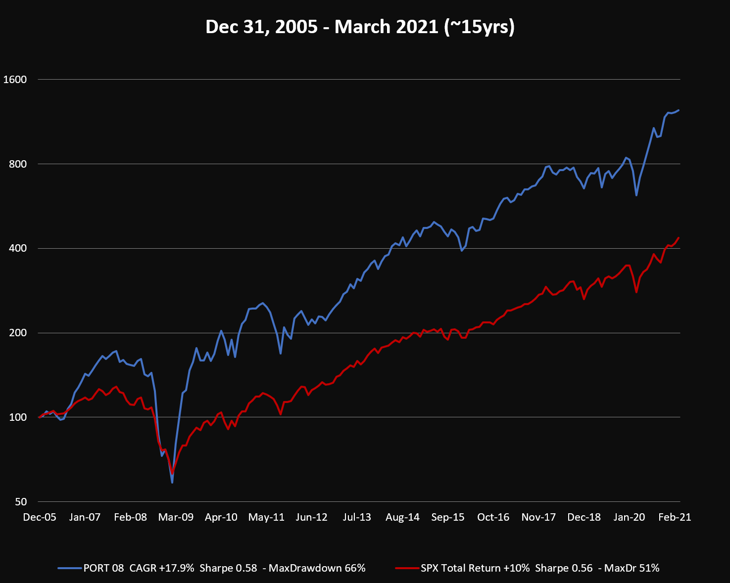 ¿Qué se puede deducir de lo anterior? El portafolio ha sufrido caídas importantes a lo largo de 15 años siendo la mayor en el 2008 (-66%). Al parecer cada 3 o 4 años existen ajustes pronunciados, pero lo más importante es recordar que a pesar de ello, se han cumplido los objetivos de inversión en dicho periodo. En la siguiente gráfica se puede observar el comportamiento de mi portafolio “08” y del índice S&P 500 Total Return, donde los rendimientos anualizados son de 17.9% y 10%, respectivamente.