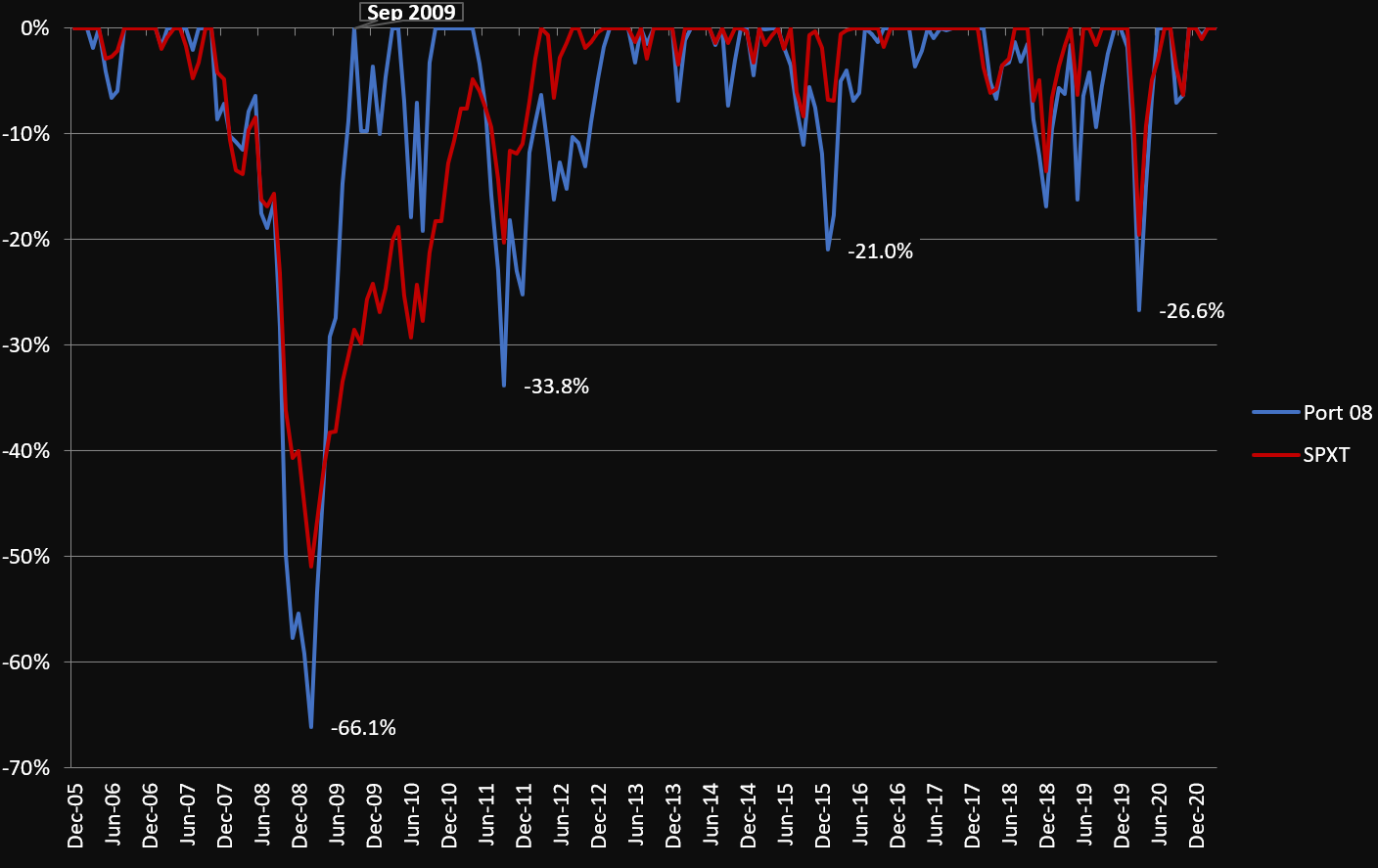 La gráfica muestra el ‘Drawdown’, que mide el retroceso actual en la curva de resultados respecto al máximo anterior. Es una forma de evaluar el riesgo de un instrumento o portafolio. Por ejemplo, en el 2008, si mi portafolio estaba valuado en un máximo histórico de $100, en la gráfica se muestra que llegó a caer hasta un 66%, es decir, mi portafolio bajó a $34 (Feb 2009). También se aprecia el tiempo que tomó en regresar a $100 (Sep 2009), cuando la línea azul, que representa mi portafolio, regresa hasta el tope. La línea roja representa el índice S&P 500, que también sufre de volatilidad. El Portafolio 08 tardó en regresar a su máximo histórico en aproximadamente 7 meses, mientras que el S&P lo hizo en marzo del 2012, 38 meses después.