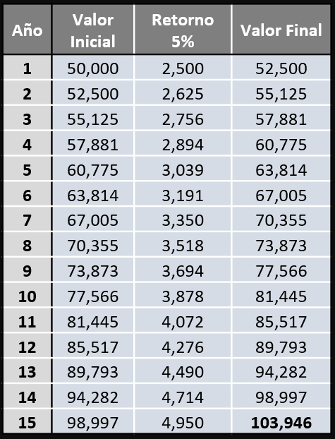Cabe destacar que el ahorro permanece igual durante 15 años, mientras que en el primer año representa un 10% del valor inicial (5,000 / 50,000), para el año 10 ya baja a 1.9% (5,000 / 259,823). Tal vez sea posible que el inversionista ahorre una mayor cantidad con el paso del tiempo, con claros beneficio en el largo plazo.