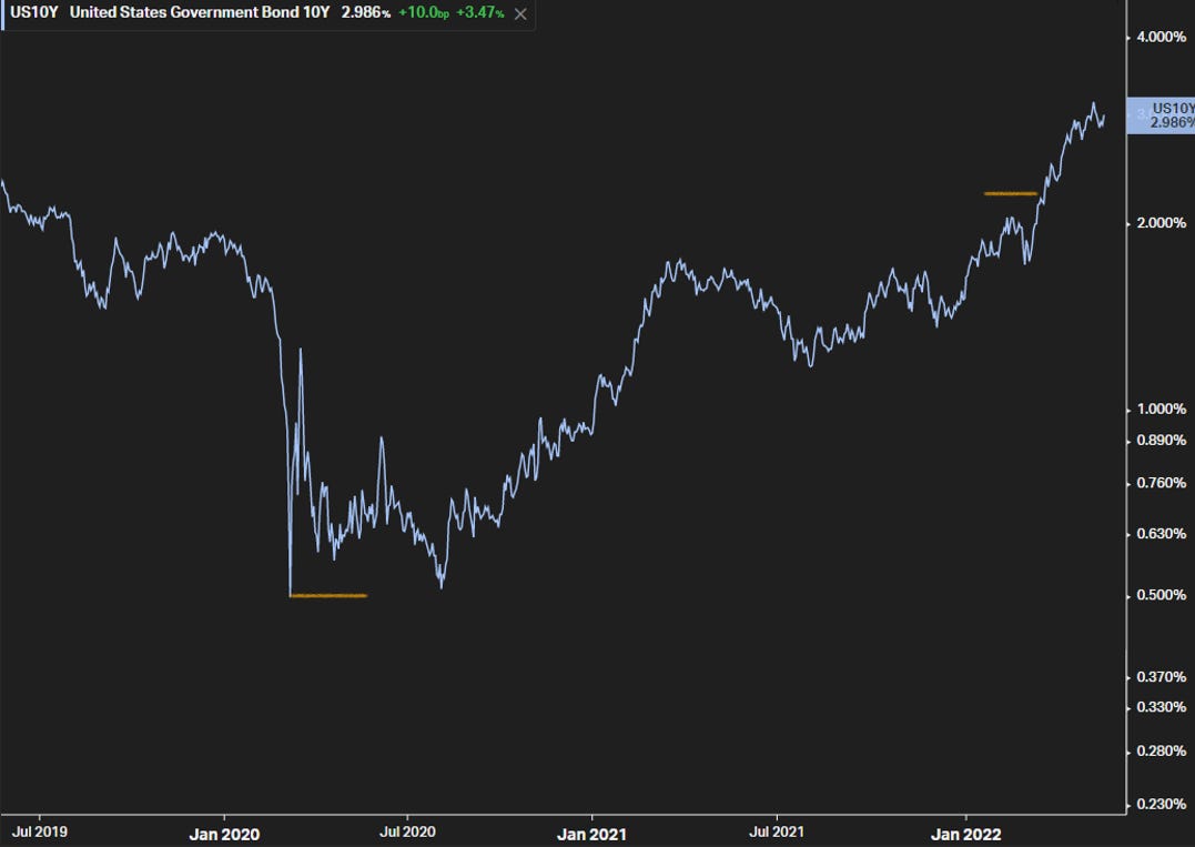 La tasa del bono del Tesoro de 10 años (T10) llegó a tocar mínimos históricos de 0.498% (marzo 2020), y el día que la Fed decidió subir su tasa de referencia por solamente 0.25% (marzo 16, 2022), el T10 ya había llegado a 2.19%: