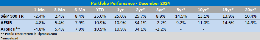 Todo parecía indicar que las tasas de interés bajarían a niveles que impulsarían a diferentes sectores económicos, donde ciertas empresas verían sus acciones subir notablemente. El portafolio AFSIR se rebalanceó en el transcurso del año con la expectativa de que las tasas de interés sí bajarían a niveles mas moderados. Sin embargo, al día de hoy ya no se espera que bajen significativamente en los próximos 12 meses. La razón… nuevo gobierno con políticas fiscales inflacionarias. Debido a lo anterior, el portafolio no tuvo un buen rendimiento en diciembre 2024 (-4.8% vs -2.4% del S&P 500 Total Return).