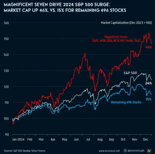 El valor de mercado de las 7 Magníficas subió 46% vs 15% del resto de las 496 acciones del S&P 500: