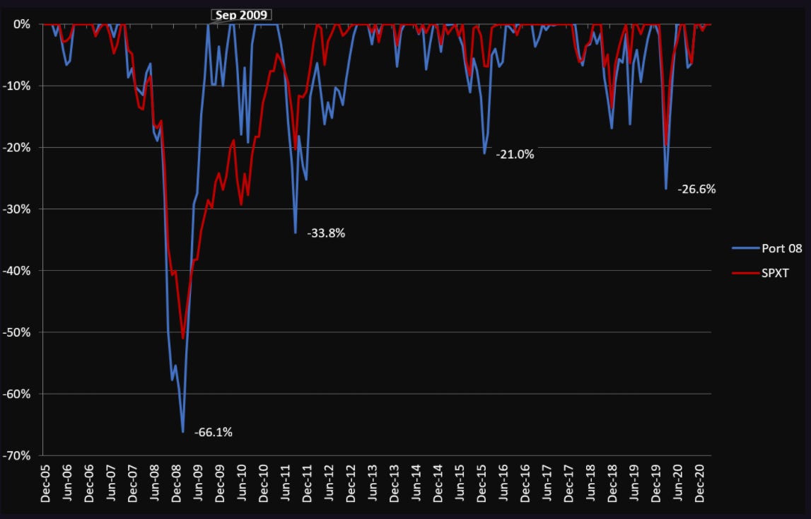 No solo basta superar al S&P 500, sino debe ser lo suficientemente bueno para justificar la volatilidad – la marea - de tu portafolio. De lo contrario, tal vez sea mejor invertir en un índice, despreocuparse y dejarlo crecer a largo plazo. La volatilidad se puede apreciar con la gráfica del drawdown (explicado en No es magia, es interés compuesto) que les presento en figura 2. Sí, he sufrido de alta volatilidad a lo largo de los años, y aún así considero que mis rendimientos han sido lo suficientemente buenos para justificarse (figura 3).