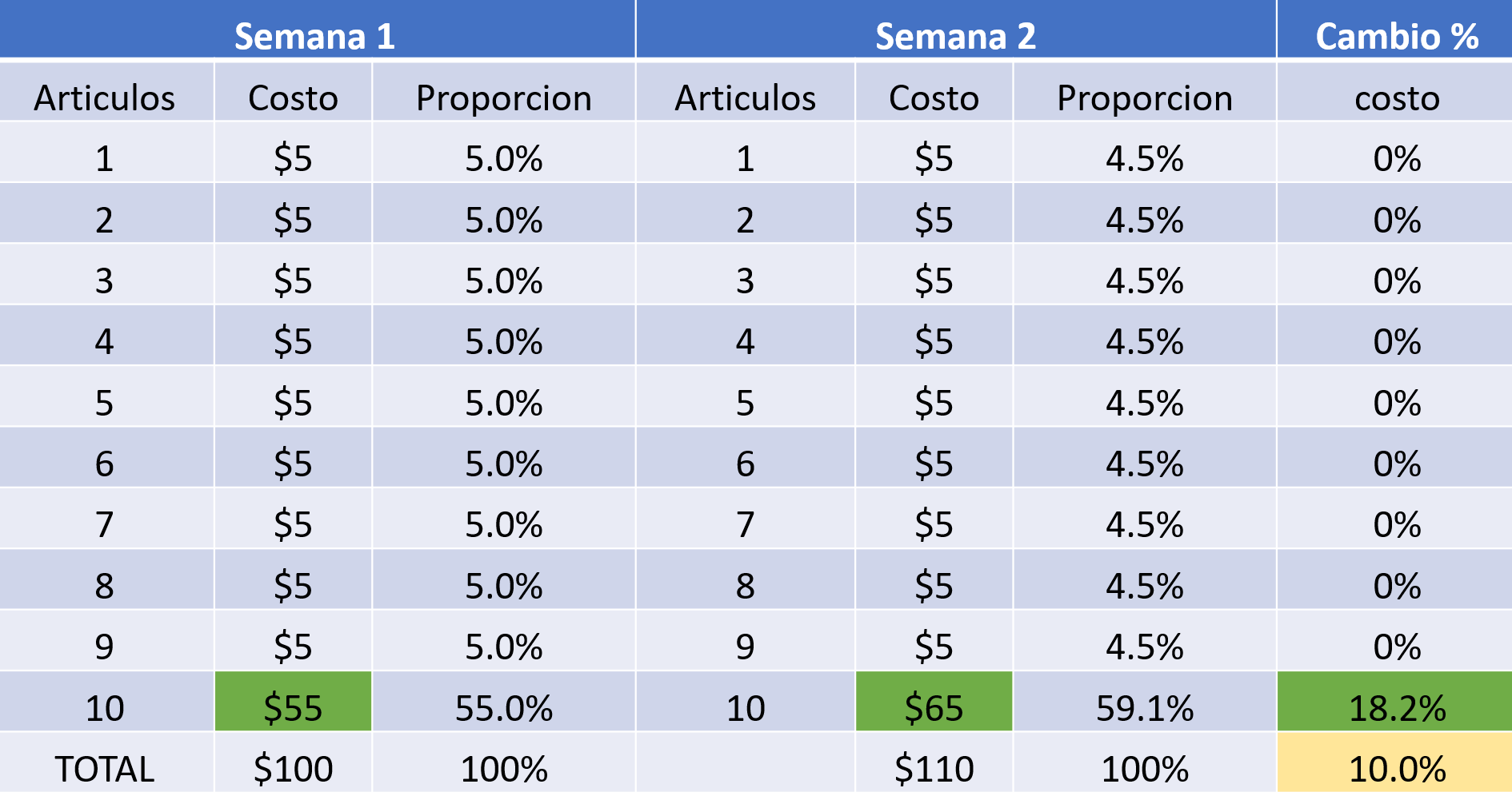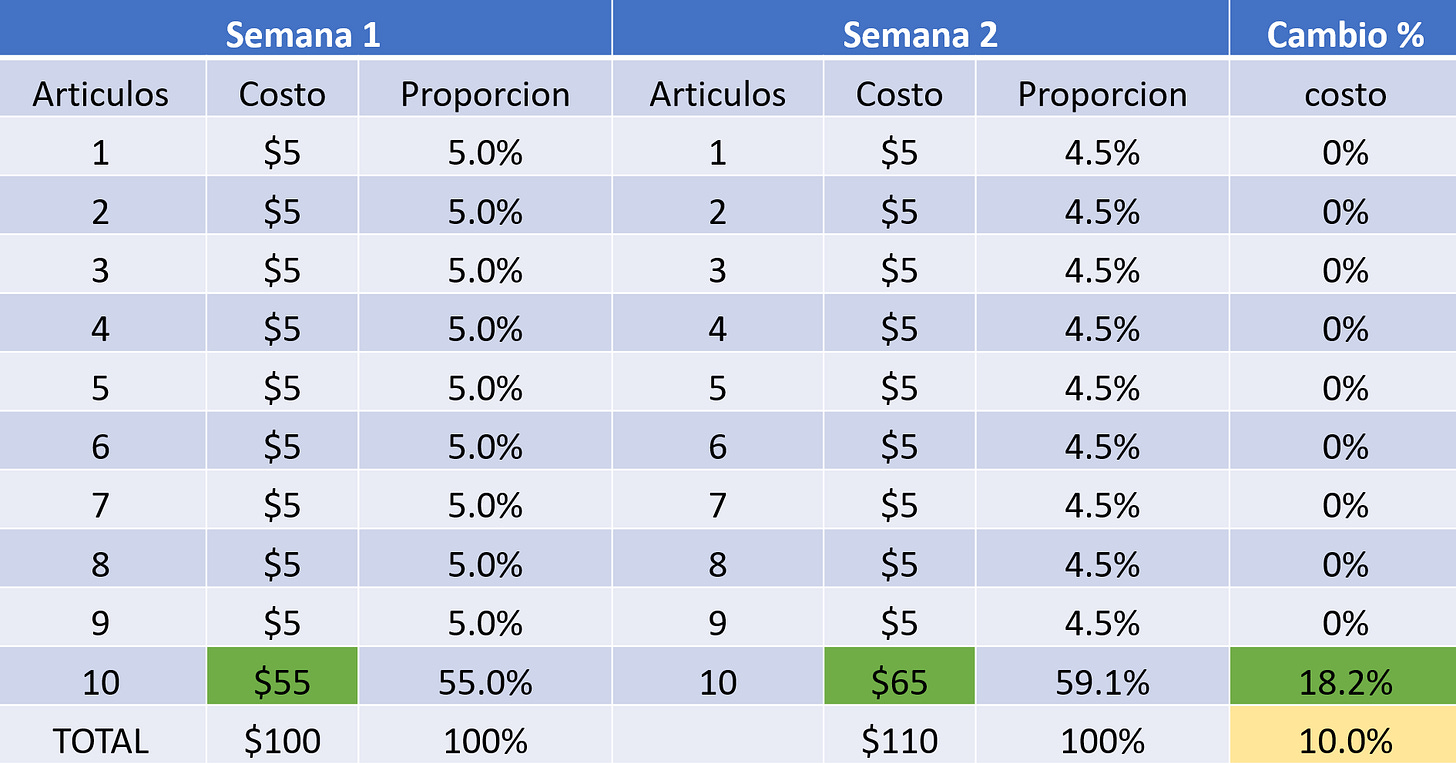 Cada semana se compra del mercado 10 artículos de distinto valor cada uno. Siempre serán los mismos y el costo total de esa canasta es de $100. Si la próxima semana el costo subió a $110, se diría que aumento 10%. Revisando el comprobante de venta se detecta que un solo artículo, el mas costoso, subió de precio. En la figura 1 se aprecia que el artículo #10, con costo inicial de $55 subió 18% para llegar $65 en la segunda semana, sin embargo, la canasta total solo subió 10%. Ese artículo es de suma importancia para ti, ya que su cambio de precio puede tener un mayor impacto en la canasta.
